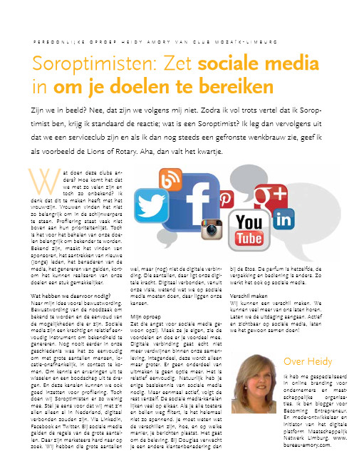 Soroptimisten: Zet sociale media in om je doelen te bereiken.Zijn we in beeld? Nee, dat zijn we volgens mij niet. Zodra ik vol trots vertel dat ik Soroptimist ben, krijg ik standaard de reactie; wat is een Soroptimist? Ik leg dan vervolgens uit dat we een serviceclub zijn en als ik dan nog steeds een gefronste wenkbrauw zie, geef ik als voorbeeld de Lions of Rotary. Aha, dan valt het kwartje. [Lees meer...]